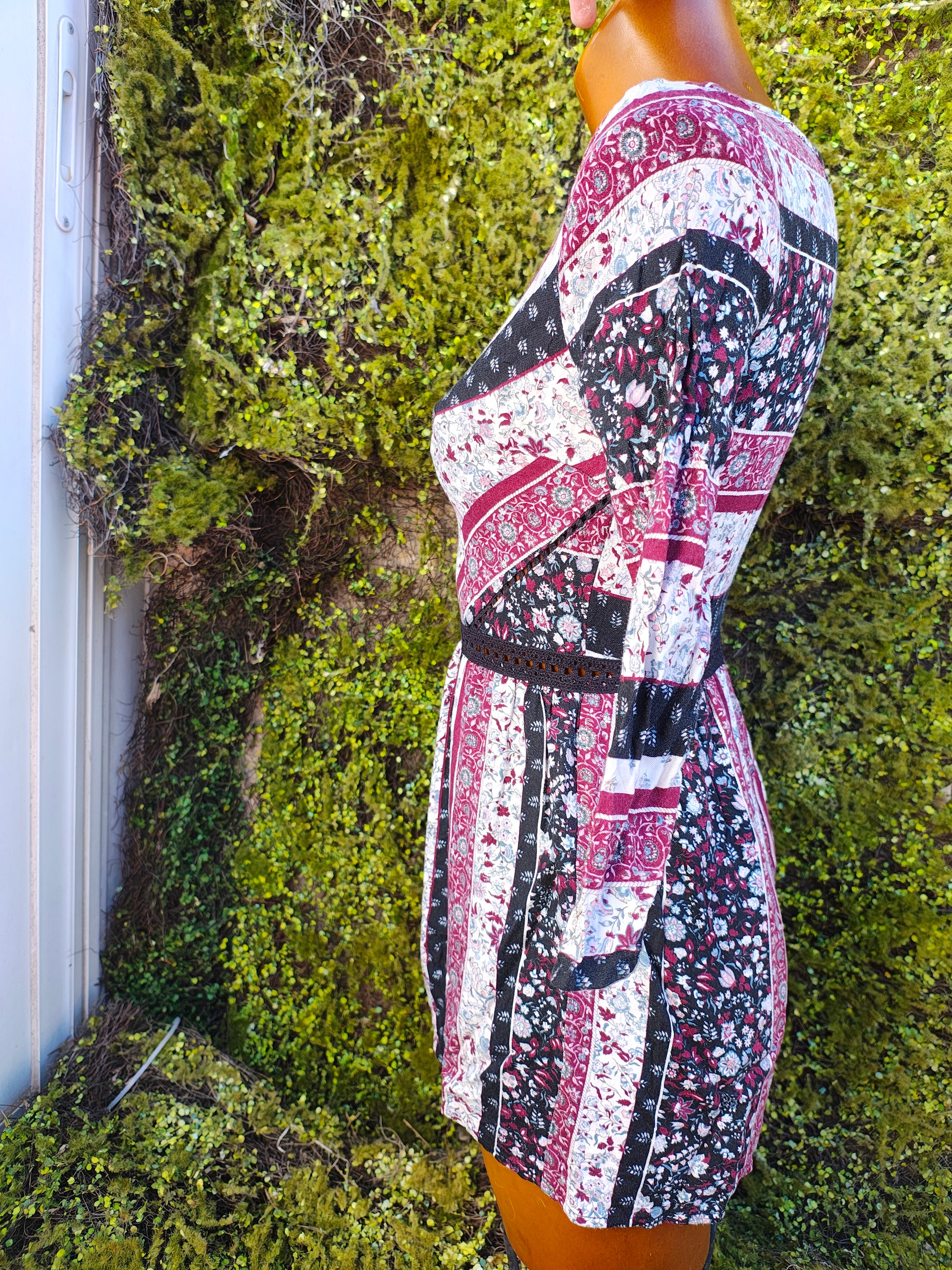 🌸 Mono corto de Bershka en tonos burdeos, negro y blanco con estampado boho de inspiración étnica.