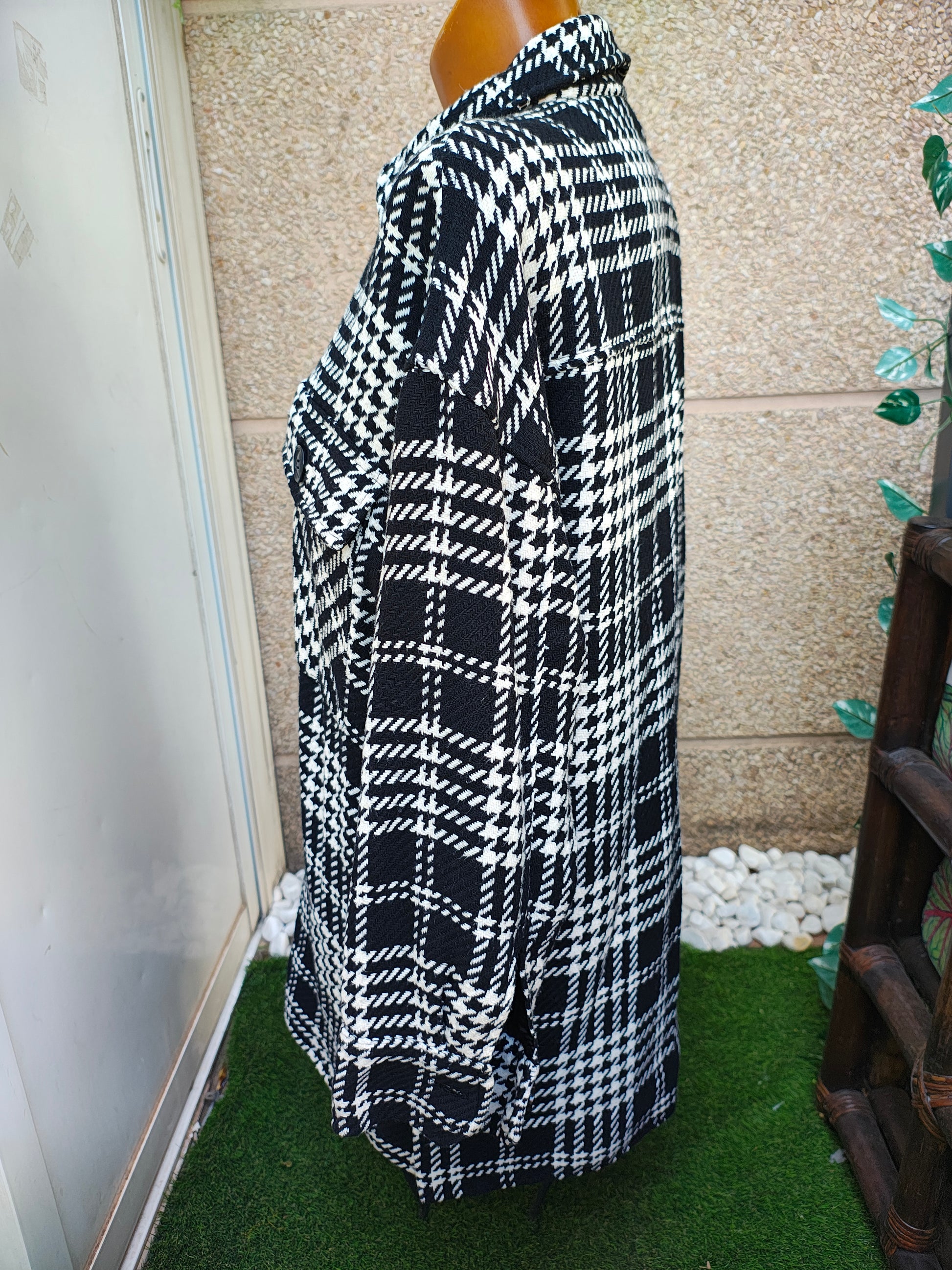🧥 Sobrecamisa estilo shacket con estampado de cuadros grandes en blanco y negro, ideal para un look urbano y casual. Diseño con cuello camisero, cierre frontal de botones y dos bolsillos en el pecho con solapa. Corte recto y ligeramente oversize, perfecta para combinar con vaqueros, camisetas básicas o vestidos ajustados. Prenda versátil para entretiempo y otoño/invierno.