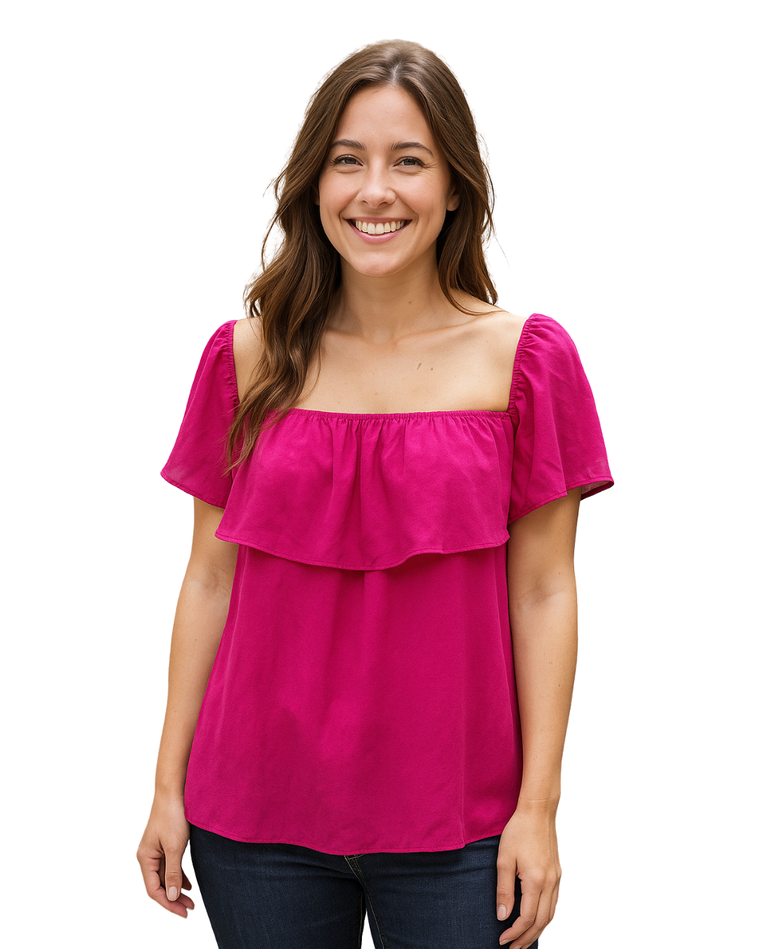 🌸 Top palabra de honor en vibrante tono fucsia con tejido vaporoso y acabado fluido. Diseño sin tirantes con elástico superior para mejor sujeción. Volantes en los hombros que añaden un toque femenino y romántico. Corte suelto y favorecedor para días calurosos.