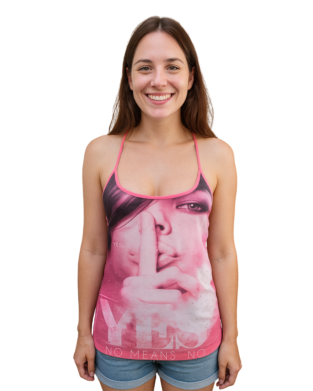 💗 Top de tirantes finos estilo racerback con estampado frontal de rostro femenino en tonos rosa y blanco. Diseño ajustado con aberturas laterales y cremallera metálica en la espalda. Decorado con pequeñas aplicaciones brillantes en la parte delantera.