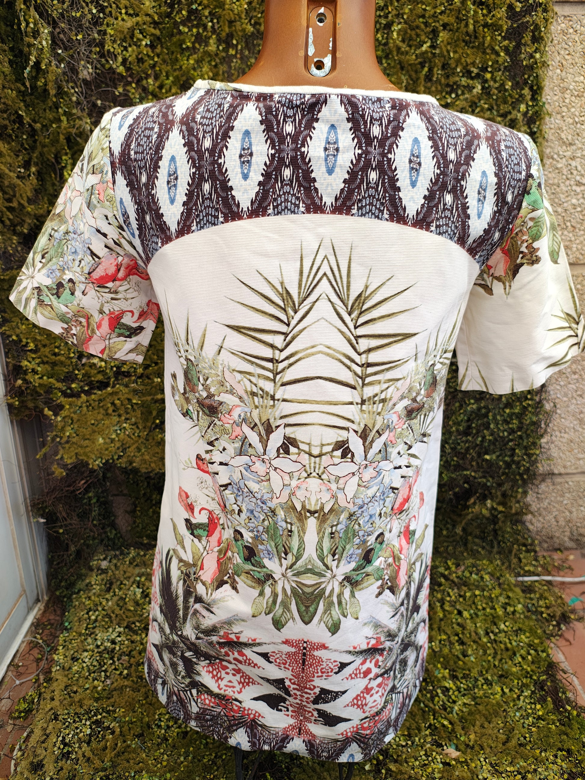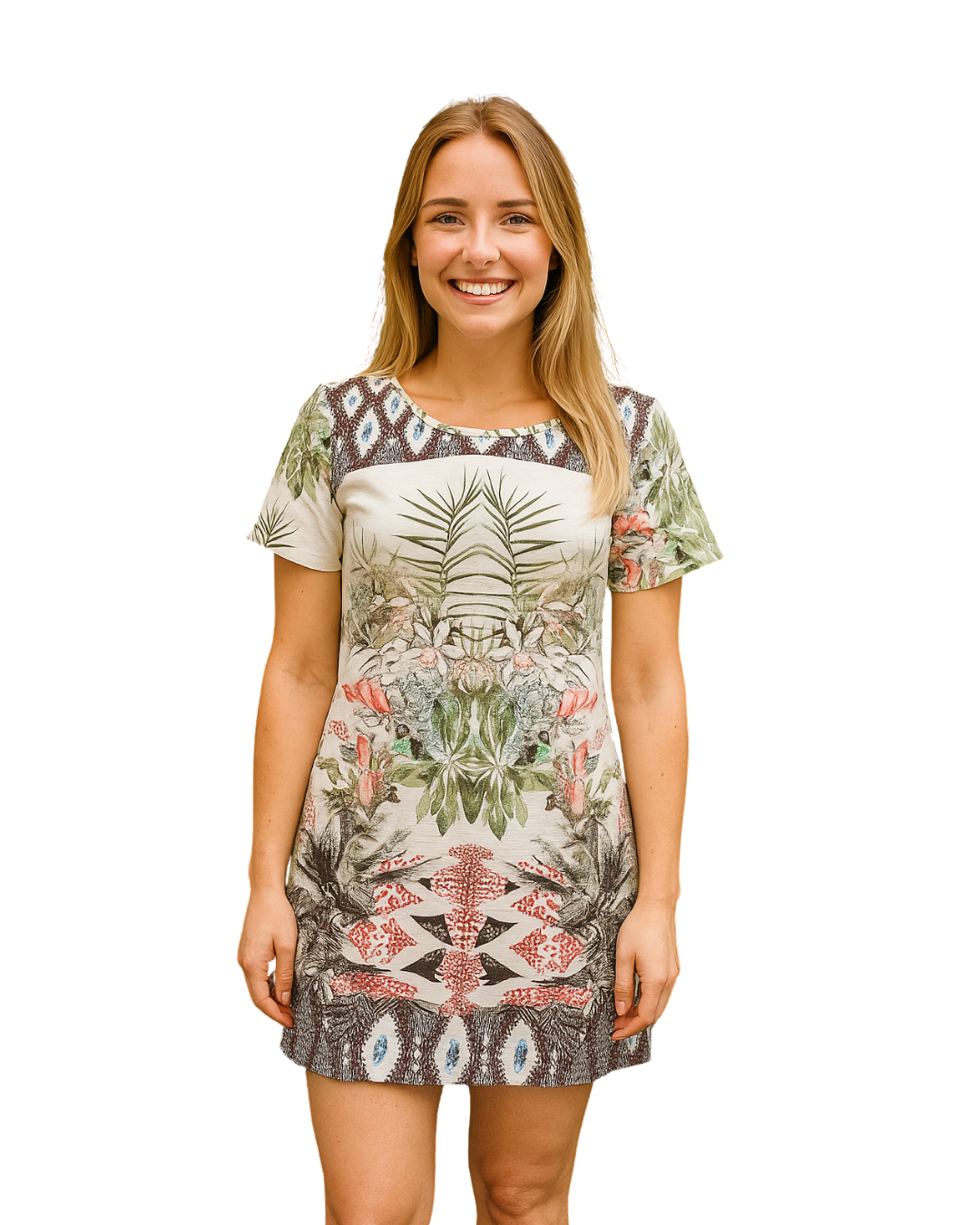 🌺Vestido estilo camiseta de manga corta con un llamativo estampado simétrico que mezcla motivos étnicos, flora tropical y aves exóticas sobre fondo blanco roto. Corte recto y cómodo, ideal para climas cálidos y looks relajados pero con personalidad. 🌴