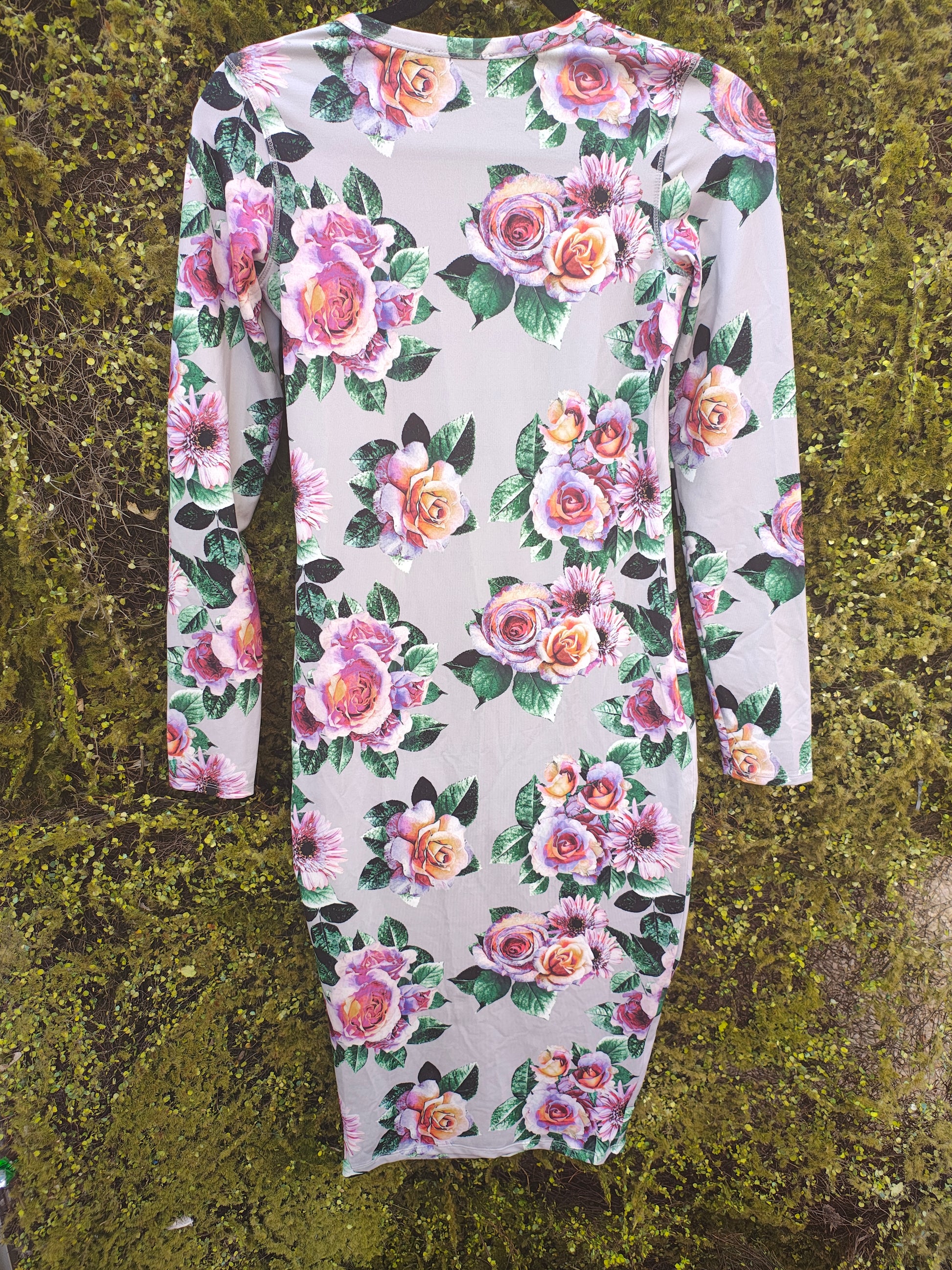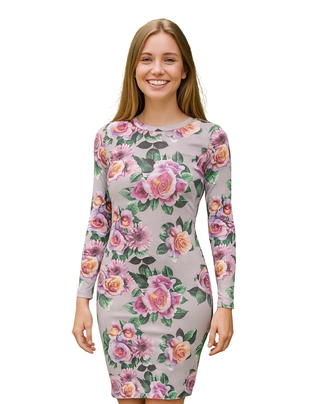 🌸 Vestido ajustado de manga larga con estampado integral de flores grandes en tonos rosa, lila, verde y amarillo sobre fondo claro. Corte ceñido que realza la silueta, con cuello redondo y tejido elástico que se adapta al cuerpo.