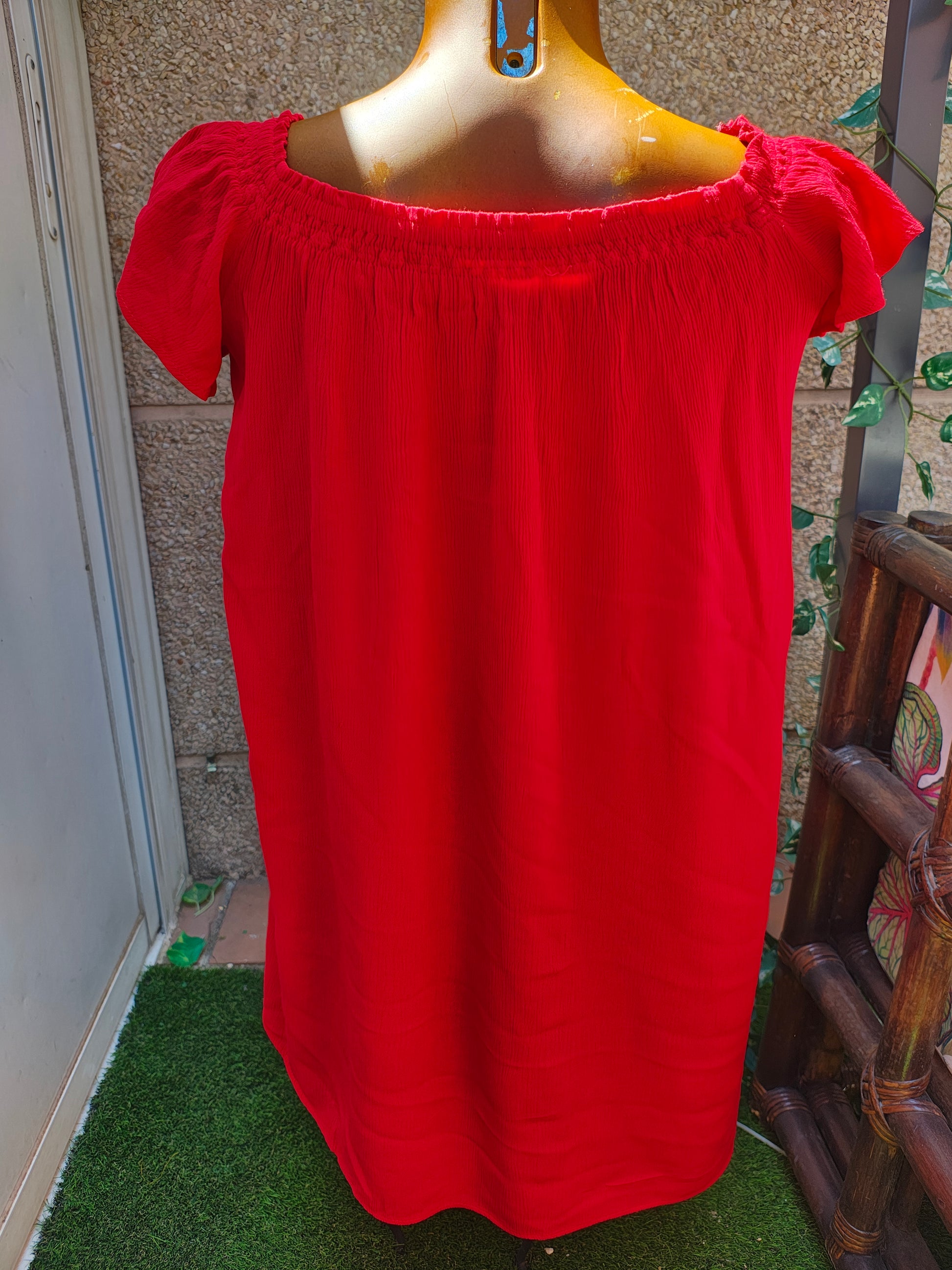 🔥 Vestido corto en un vibrante color naranja con escote elástico tipo barco y mangas con volantes, ideal para llevar con los hombros al aire. Tejido fluido con textura acanalada de caída ligera que aporta comodidad y estilo. Corte amplio tipo túnica, perfecto para días calurosos o para combinar con cinturón y darle forma a la silueta.