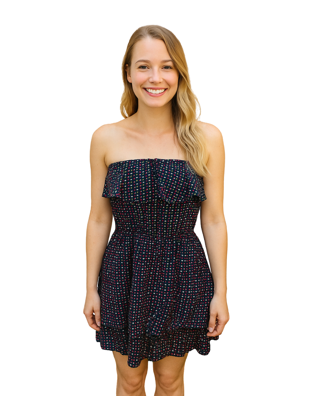 🎯 Vestido corto sin tirantes en color negro con estampado de lunares pequeños en tonos blanco, rojo, naranja y rosa. Diseño con volante en el escote y cintura elástica para un ajuste cómodo, falda con caída ligera y vuelo femenino.